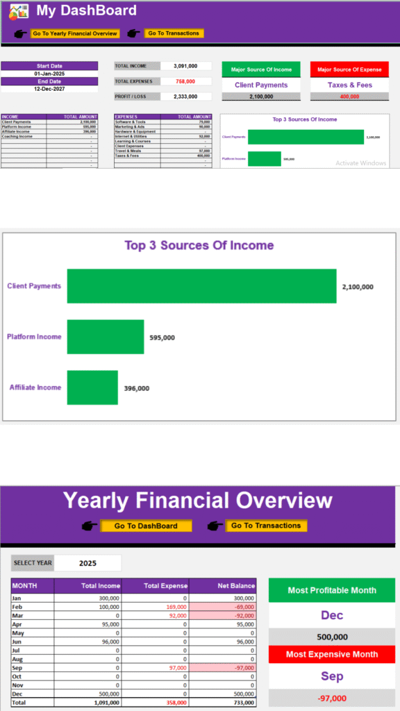 It provides dynamic dashboards, yearly financial overviews, and automated charts that make your financial data easy to understand and visually appealing.